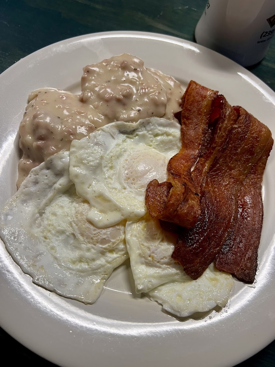 This is a nice little diner. The staff is friendly and takes care of you. The food is good. The home fried potatoes were ok as was the sausage gravy. The biscuits are fresh. They had a special omelette the day we were there. It was Burrito omelette and it was packed with seasoned ground beef. It was real tasty. The bacon was ok. The atmosphere is dated. I would dine here again. We visited on 7/12/25